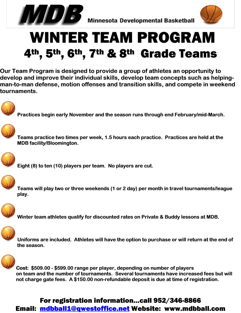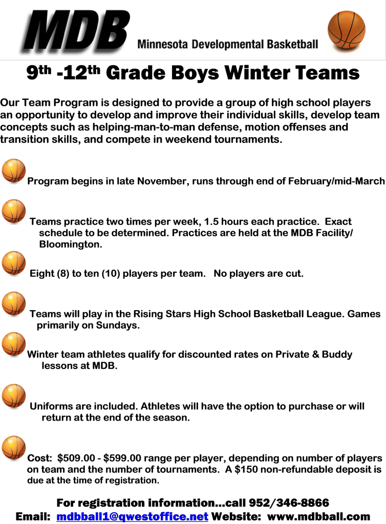 MDB teams are designed to give athletes an opportunity to develop and improve their individual skills, develop team concepts such as helping man-to-man defense, motion offenses & transition skills, and compete in weekend tournaments.